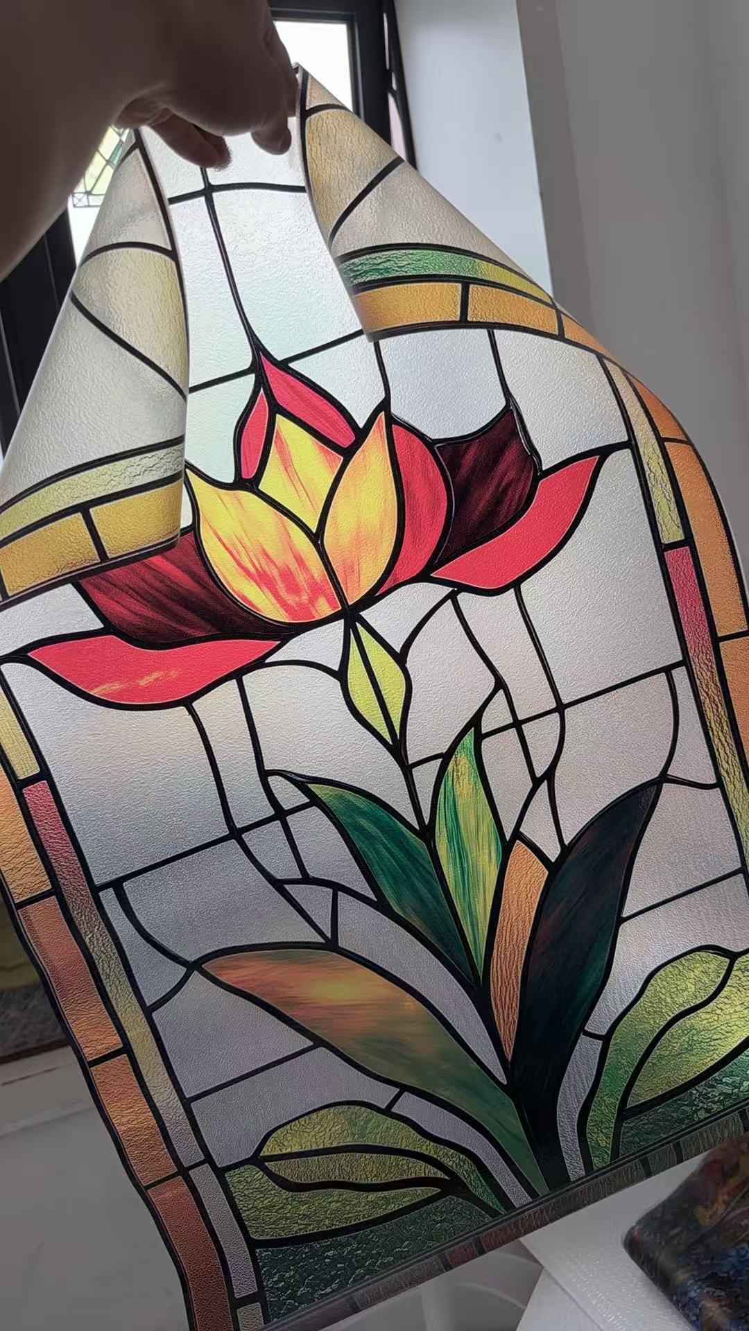 A1. This is a custom-size window privacy film with a printed stained-glass effect. It is static-cling, non-adhesive, removable, and reusable. It adds daytime privacy and soft light diffusion while keeping spaces bright. It is a printed effect, not real glass.
