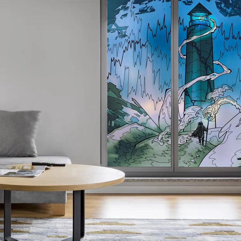 Custom Size Stained Glass Films,Privacy Static Cling,Print Castle, Lighthouse Tower, Sailboat Door Sticker,Office, Home Decor