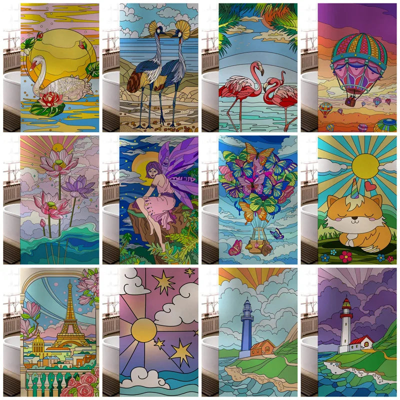 Stained Glass Window Film, Frosted Glass Sticker, Custom Size Castle Cartoon Pattern for Kids Room Door, Poster, Home Decor